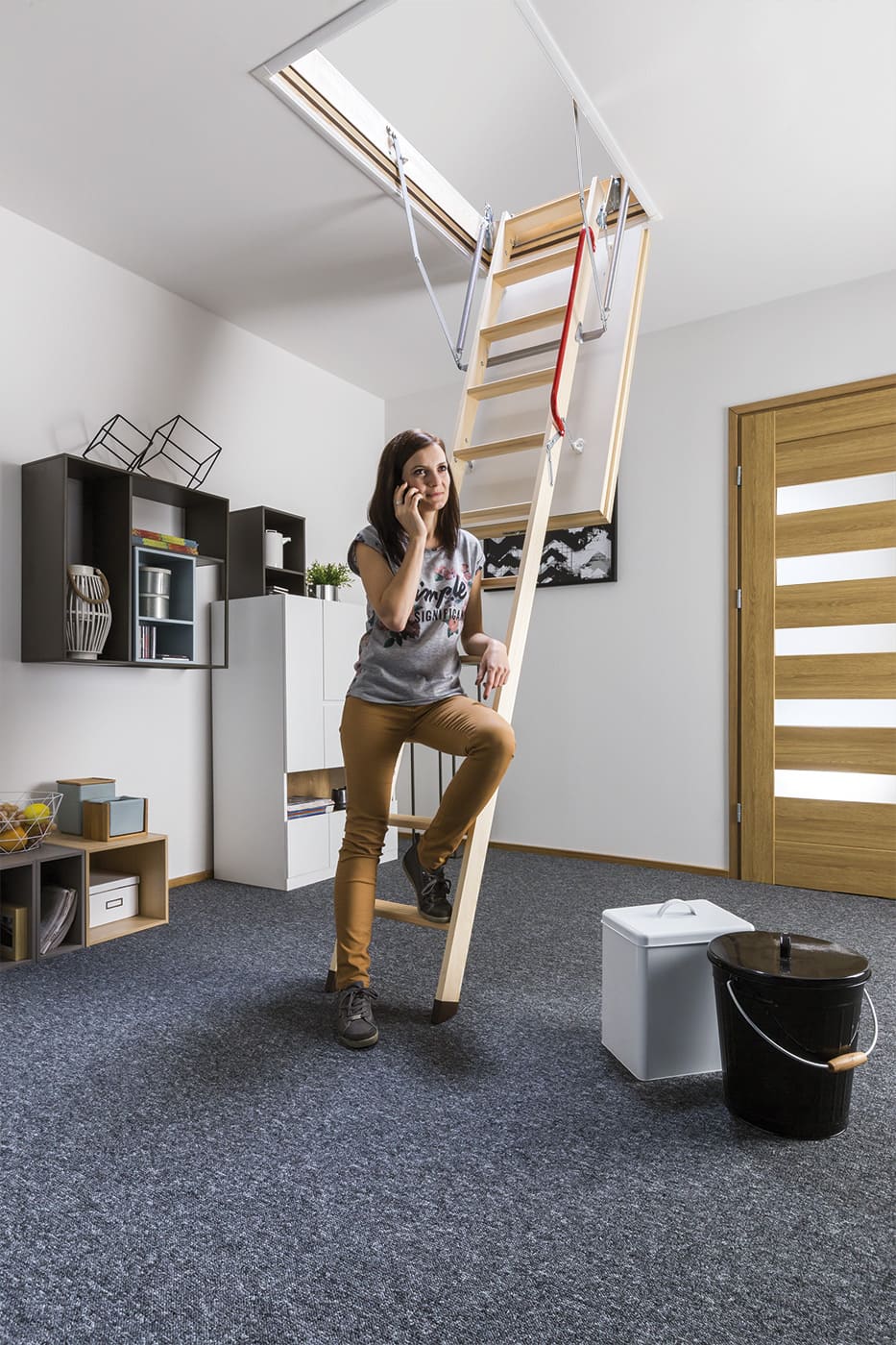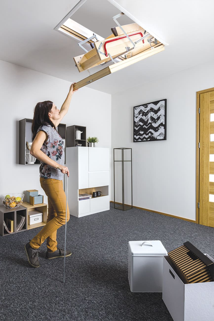Люк с лестницей / Деревянная лестница на чердак FAKRO Термоизоляционная лестница LTK Thermo – практичная раскладная модель чердачной лестницы, выполненная из сосновой древесины. Толщина крышки люка составляет 66 мм, поэтому изделие подходит для домов со значительной разницей температур между этажами. Отделка белым ДВП позволяет органично вписать припотолочную часть конструкции в классический дизайн. Поручни и антискользящие ступени обеспечивают безопасность эксплуатации.
